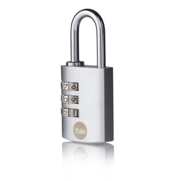 Yale 30mm combinatie hangslot met stalen beugel en mat chroom finish. Eenvoudig zelf in te stellen 3 cijferige code. Type Y151B/30/125/1