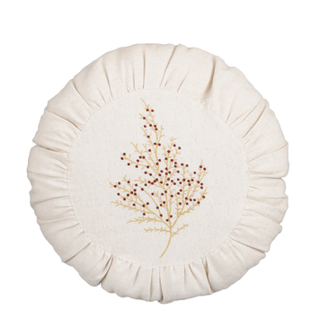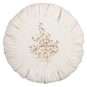 Haal de herfst in huis met dit ronde Yara kussen! Het kussen is voorzien van een mooi borduursel in de vorm van een blad. De beige, bordeaux, lichtroze en gele kleuren geven het kussen een klassieke uitstralingen. De plooien aan de zijkant van het kussen zorgen voor wat meer speelsheid. Leuk voor op de bank of in een mooie fauteuil. De afmetingen zijn L45 x B45 cm.