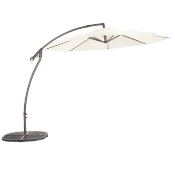 De Zweefparasol Havana ecru d300 cm is een ronde, in hoogte verstelbare parasol. Het doek is gemaakt van polyester, is ecru van kleur en biedt een uv-bescherming van factor 30. Zo zit je beschermd tegen de allerfelste zonnestralen toch lekker buiten. Het fijne van een zweefparasol is bovendien dat de parasolvoet buiten de schaduwruimte geplaatst kan worden. Hierdoor heb je een vrij schaduwvlak zodat je, bijvoorbeeld met een tuinset of kinderbadje, geen rekening hoeft te houden met een parasolpaal. De metalen delen van deze parasol zijn gemaakt van roestvrij staal. Gespetter, nat worden of een regenbuitje is dus geen probleem, de parasol blijft roestvrij. Tot slot is de parasol in hoogte verstelbaar. Zo kan je de parasol bijstellen als de zon hoger of lager komt de staan. Kortom, de Zweefparasol Havana ecru d300 cm is een fijne parasol voor iedereen die vaak of langdurig buiten zit. Zweefparasol Havana ecru d300 cm wordt geleverd exclusief parasolvoettegels. Parasolvoettegels zijn nodig om de zweefparasol op zijn plaats te houden. Deze zijn los verkrijgbaar. Zweefparasol Havana ecru 300 cm heeft een diameter van 300 centimeter.