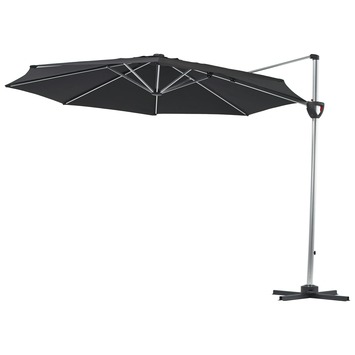 De Zweefparasol Jakarta zwart d300 cm is een ronde zweefparasol met een diameter van 300 centimeter. Het doek is gemaakt van zwart polyester en biedt een uv-bescherming van factor 50. Zo zit je beschermd tegen de allerfelste zonnestralen toch lekker buiten. Het fijne van een zweefparasol is bovendien dat de parasolvoet buiten de schaduwruimte geplaatst kan worden. Hierdoor heb je een vrij schaduwvlak zodat je, bijvoorbeeld met een tuinset of kinderbadje, geen rekening hoeft te houden met de parasolpaal. Het frame van deze parasol is gemaakt van aluminium. Gespetter, nat worden of een regenbuitje is dus geen probleem, het frame blijft roestvrij. De Zweefparasol Jakarta zwart d300 cm is een fijne parasol voor iedereen die veel, vaak of langdurig buiten zit. Zweefparasol Jakarta zwart d300 cm wordt geleverd exclusief parasolvoettegels. Parasolvoettegels zijn nodig om de zweefparasol op zijn plaats te houden. Deze zijn los verkrijgbaar.