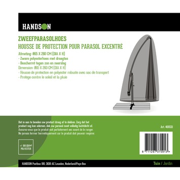 De zwarte polysesterhoes met draagtas is geschikt voor sweefparasollen. De hoes beschermt tegen zon en neerslag. De afmetingen zijn (hxbxd) 260x65x65 cm.