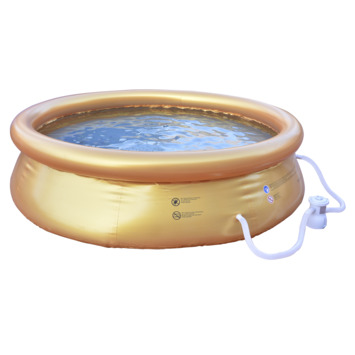 Gekocht om uit te testen met het warme weer. Opzetten ging perfect (let op wel op rechte ondergrond met iets eronder, in mijn geval campingdoek). Verder vol laten lopen en al een dikke week in gebruik zonder klachten. Lekker dat hij niet 3 meter is maar net iets kleiner. Toch nog steeds ruim genoeg voor 3 a 4 personen. Blij mee! Kleur is wel behoorlijk goud!