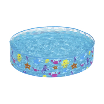 Met dit zwembad heeft je kind gegarandeerd uren speelplezier. Het bad is gemakkelijk op te zetten door de 'harde' rand die je snel uitklapt, waarna je het zwembad vult met water. Opblazen is niet nodig! De rand is transparant en bevat een leuke print van waterdieren. De diameter van dit zwembad is 122cm breed en 25cm hoog.