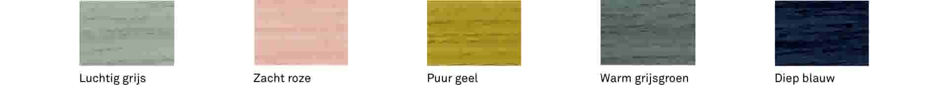 Hout lakken of beitsen in huis kan in veel verschillende transparante kleuren. CetaBever heeft een uitgebreid assortiment kleuren voor Deur-, Kozijn- & Meubelbeits, Meubellak, Trappenlak en Vloer- & Parketlak. In 2022 zijn aan dit kleurpalet een aantal prachtige trendkleuren toegevoegd, namelijk Warm grijsgroen, Luchtig grijs, Zacht roze, Puur geel en Diep blauw.