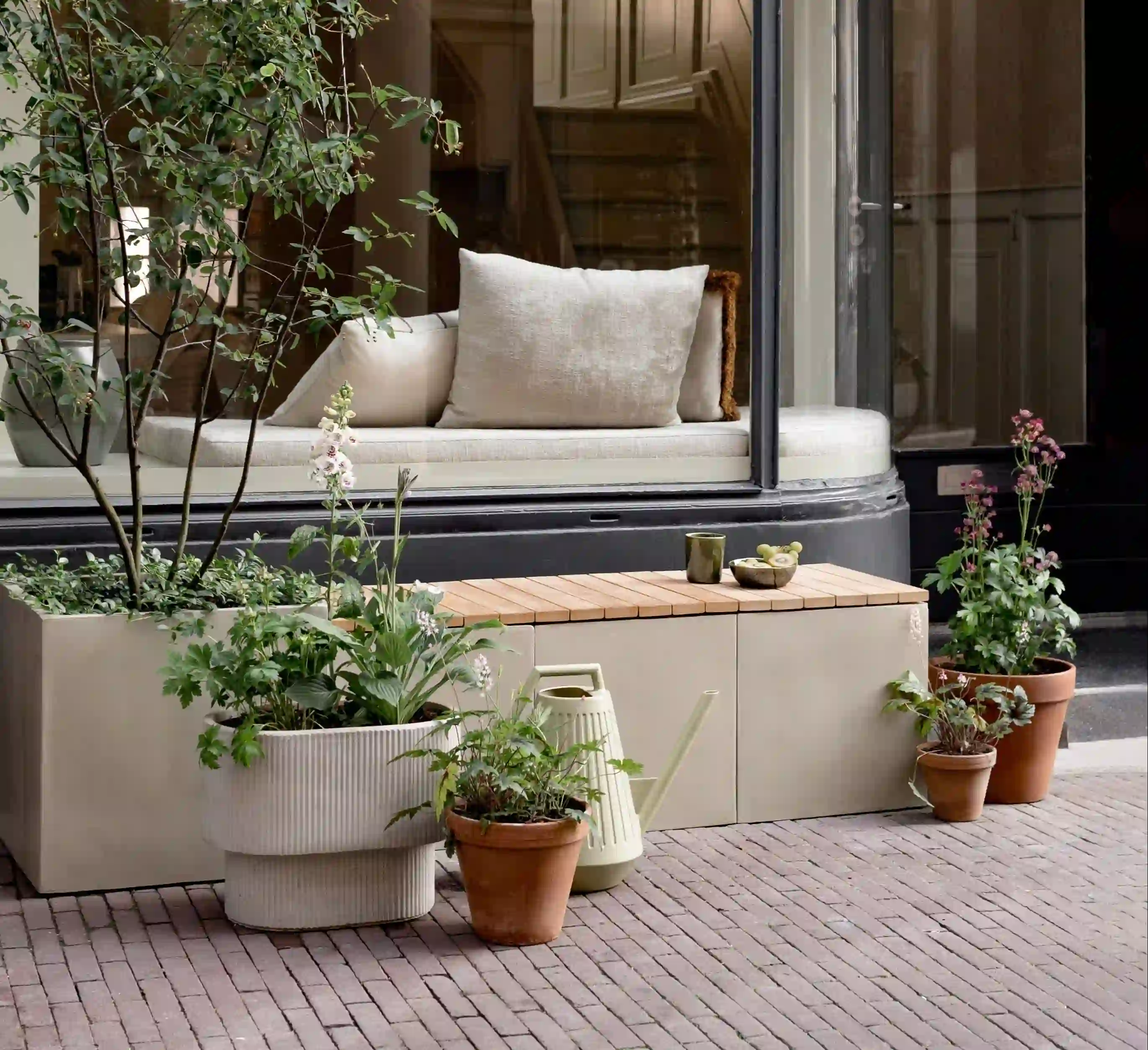 Bewonder dit DIY tuinbankje van geschilderde bloembakken en met hardhouten zitting. Gecombineerd met een gevulde bloembak en wat losse terracotta potten. Onze interieurstylist Tanja van Hoogdalem heeft weer een leuke tuin-DIY bedacht voor tegen je gevel. Bekijk de simpele stappen van de DIY en maak ook zo'n lekker plekje bij jou thuis aan de straatkant of voor je winkel, werkplek-ruimte of achter in de tuin. En wil je liever een geveltuintje in plaats van losse potten? Check dan eerst bij de gemeente of je de tegels mag verwijderen uit de stoep.
