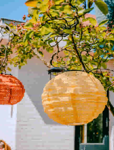 Om het geheel af te maken, voegden we kleurrijk servies, speelse verlichting en stijlvolle accessoires toe. Vooral de gekleurde lampionnetjes geven de tuin een vrolijke, zomerse uitstraling. Zo kun je hier zowel overdag als ’s avonds comfortabel zitten!