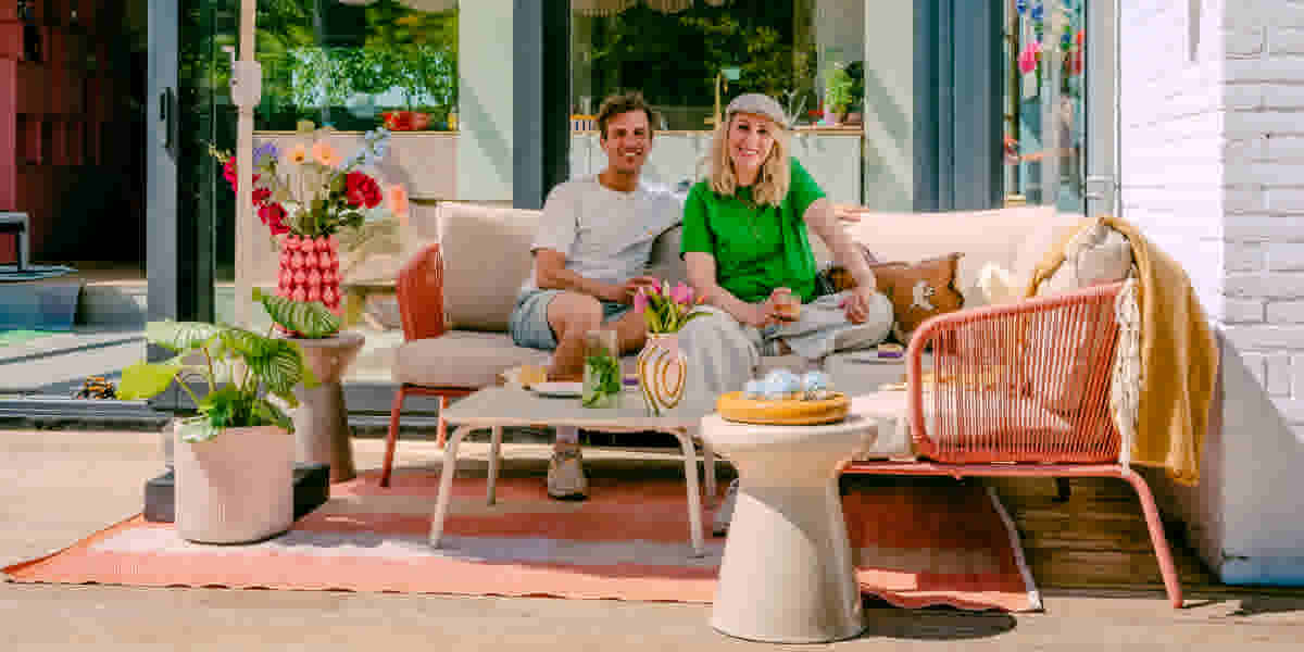 Deze keer namen we een kijkje in de tuin van Saskia en haar gezin. Zij hebben een grote tuin, maar ze wilde graag op haar terras een knus hoekje waar ze lekker quality time kan hebben met haar gezin. Haar terras was eerst nog wat kaal, maar daar is nu geen sprake meer van. Met onder andere een terracotta loungebank en een okergele parasol is een sfeervolle buitenplek ontstaan, vol kleur en karakter!