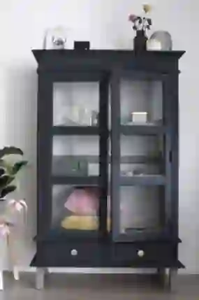 De binnenkant van de kast heb ik in de kleur van de grondverf gehouden. Ik heb bewust een grijze grondverf gekozen, zodat deze een mooie contrast heeft met de donkere buitenkant. Na het schilderwerk heeft de kast twee nieuwe knoppen gekregen. Ik heb hier gekozen voor een wat klassieke knop. Dit past goed bij de originele stijl van de kast.