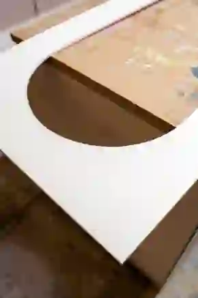 De planken maakten we van MDF. Door een reep van de plank af te zagen en in verstek te zagen, kun je een optisch dikkere plank maken. Leg de schuine kanten tegen elkaar en tape ze aan elkaar vast. Draai het geheel dan om en plaats lijm op de schuine kant. Klap het korte deel naar binnen en tape het geheel goed vast zodat het kan drogen.