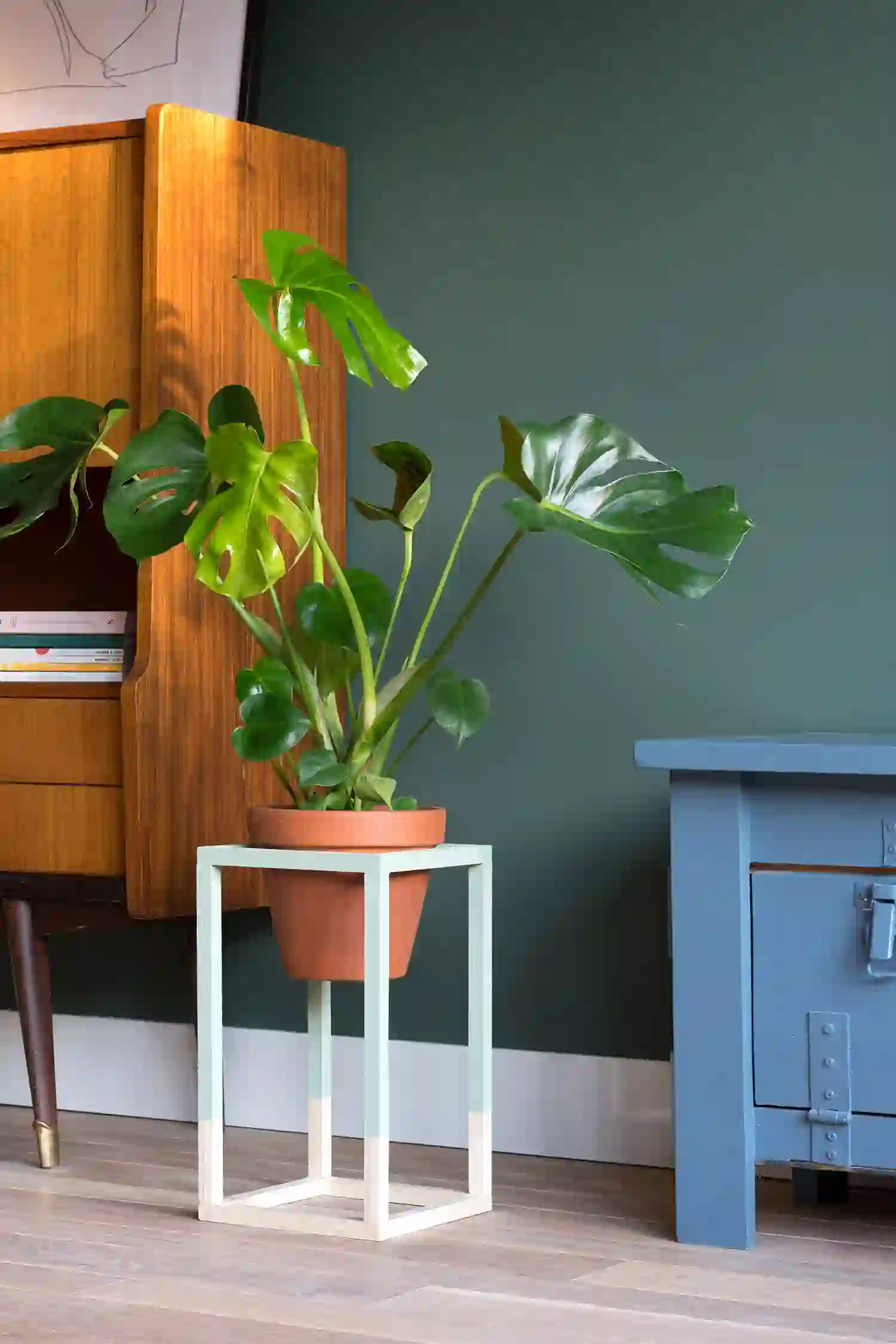 Wanneer de plantenstandaard van hout goed gedroogd is, kun je eventueel nog een kleur toevoegen met houtlak of krijtbordverf. Ik koos voor de kleur Jadegroen van Flexa Creations in een matte lak. Ik schilderde de standaard niet helemaal, omdat ik het leuk vond om nog een deel van het hout terug te zien. De bloempot met Monstera plant kreeg een plekje in de plantenstandaard en ik plaatste nog een klein terracotta schoteltje onderin de bloempot om het teveel lekken van water te voorkomen. Kijk uit met het geven van water aangezien er een gat in de onderkant van terracotta bloempotten zit. Doe het desnoods even boven de gootsteen of leg er een handdoek onder om je vloer te beschermen.