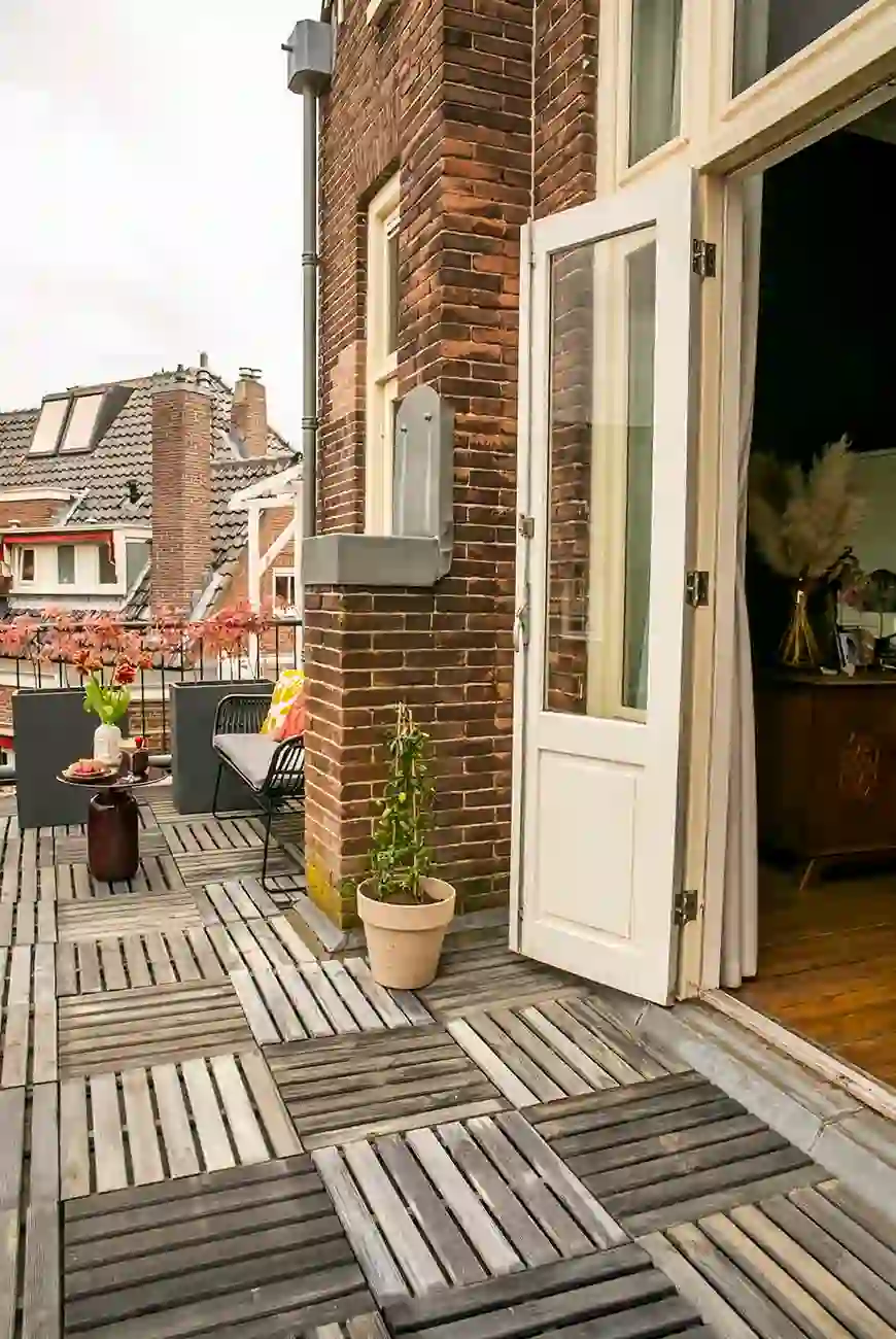 Ik koos voor een vlondertegel met reliëf zodat er minder kans is op gladheid. Daarnaast is het geimpregneerd zodat het lang meegaat én de grijze kleur vond ik beter passen bij de bakstenen gevel. Onder de vlondertegels kwamen de rubberen tegeldragers onder alle hoeken en in het midden. Dit is niet alleen om te voorkomen dat de vlondertegels gaan schuiven, maar ze hebben ook een geluiddempende werking én ze zorgen tijdens regen voor een goede afwatering. Werk dus altijd met dit soort rubberen tegeldragers, want je ondergrond gaat er langer van mee.