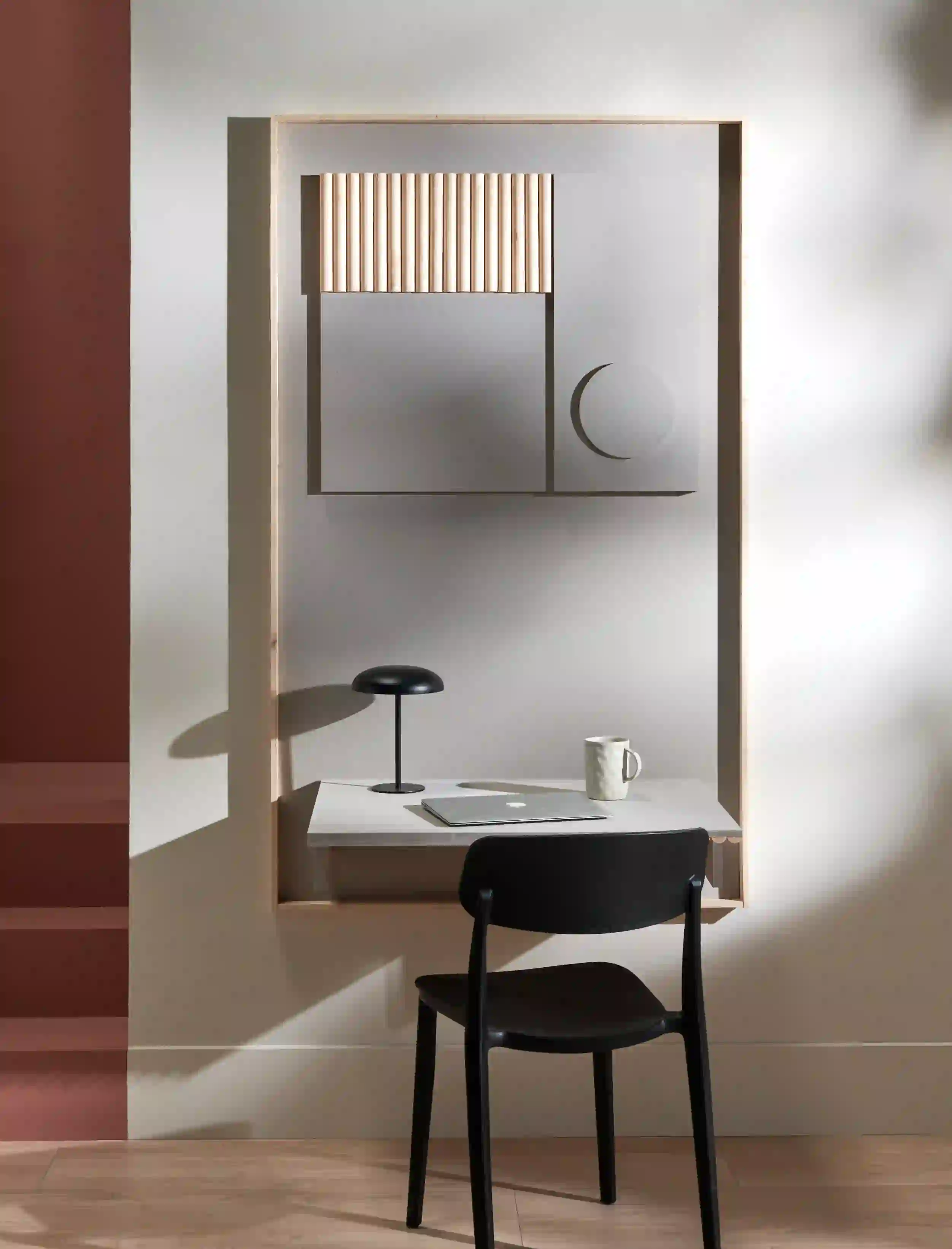 Bevestig als laatste stap de werkplek en muurdecoratie in één met schroeven en pluggen aan de wand. Ingeklapt staat netjes!