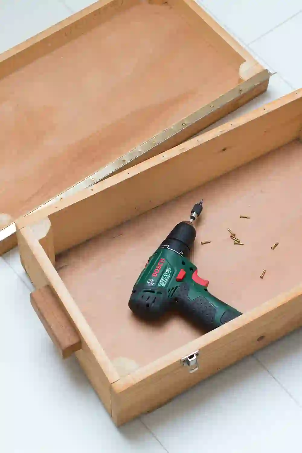 Je kunt het plankje eventueel vanaf de buitenkant van het kistje vastschroeven. Je ziet dan wel de schroeven zitten aan de buitenkant. Het mooiste is natuurlijk wanneer je de schroeven helemaal niet ziet zitten. Dit kan door het plankje blind vast te schroeven. Hiervoor heb je een schroefverbinder boorhulp nodig die je vastklemt op het plankje. Met een bijbehorende boor maak je zo heel gemakkelijk de gaten in de onderkant van het plankje. Daarna kun je het plankje van onderaf vastschroeven en zijn de schroeven als het ware onzichtbaar.