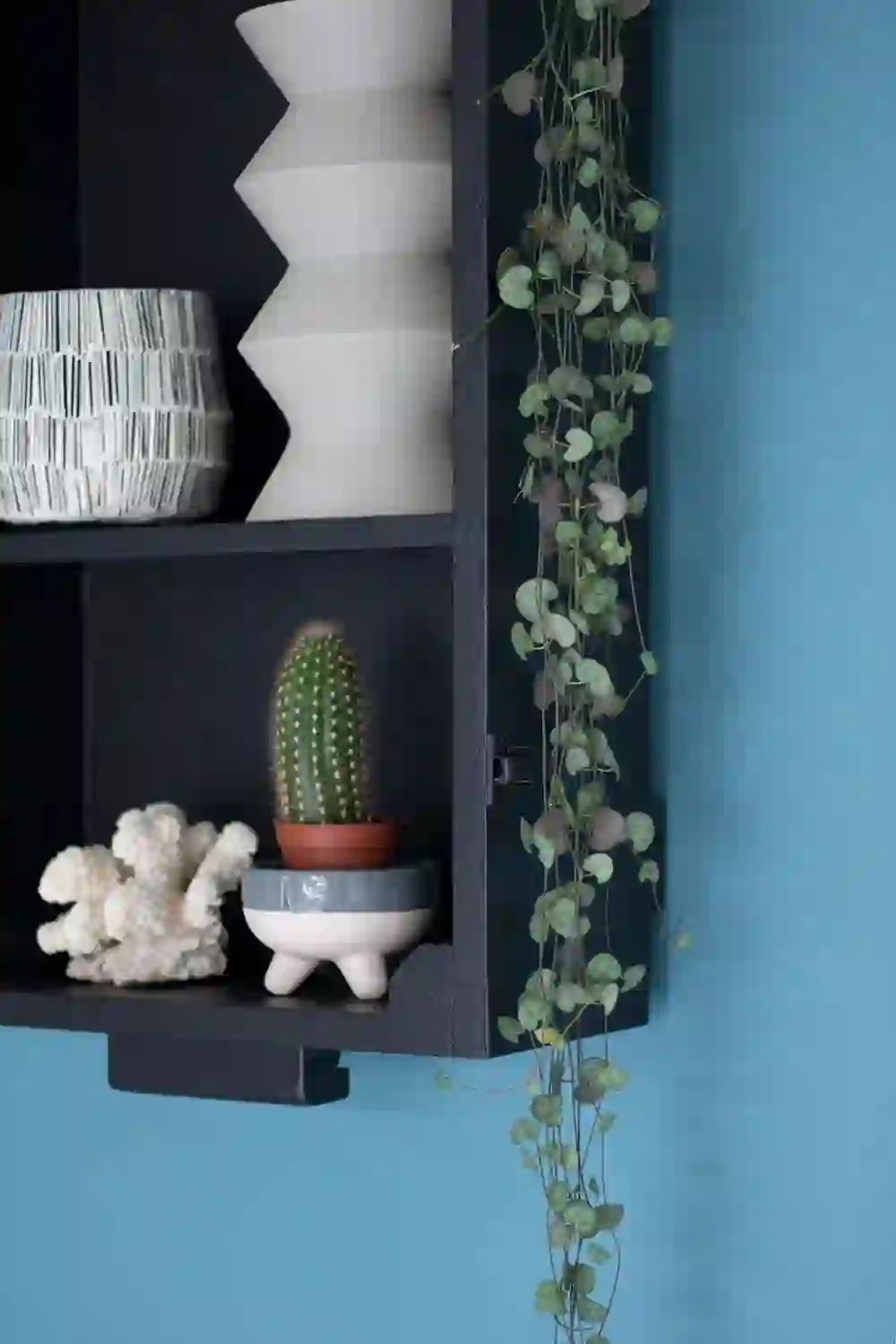 Het pronkkastje kreeg een plek op mijn werkplek die ik recent ook onder handen nam. Ik ontwierp en maakte samen met mijn vriend een op maat gemaakt bureau. De muur ging van groen naar blauw (dit is de mengkleur Summer Splash van Flexa Creations) en het kastje hing ik tegen de wand rechts van mijn bureau. Het diepe donkerblauw steekt erg mooi af tegen de frisse kleur blauw op de muur! Een aantal favoriete accessoires kregen een ereplekje in het kastje zoals de grafische vaas, een theelicht, een mini bloempotje met mini cactus en een stuk koraal. Boven op het wandkastje was nog plek voor een klein lantaarnplantje. Ik ben blij dat ik het kistje een tweede leven gaf, leuk toch zo’n pronkkastje? En hoe leuk is het om oude kringloopartikelen op te knappen?