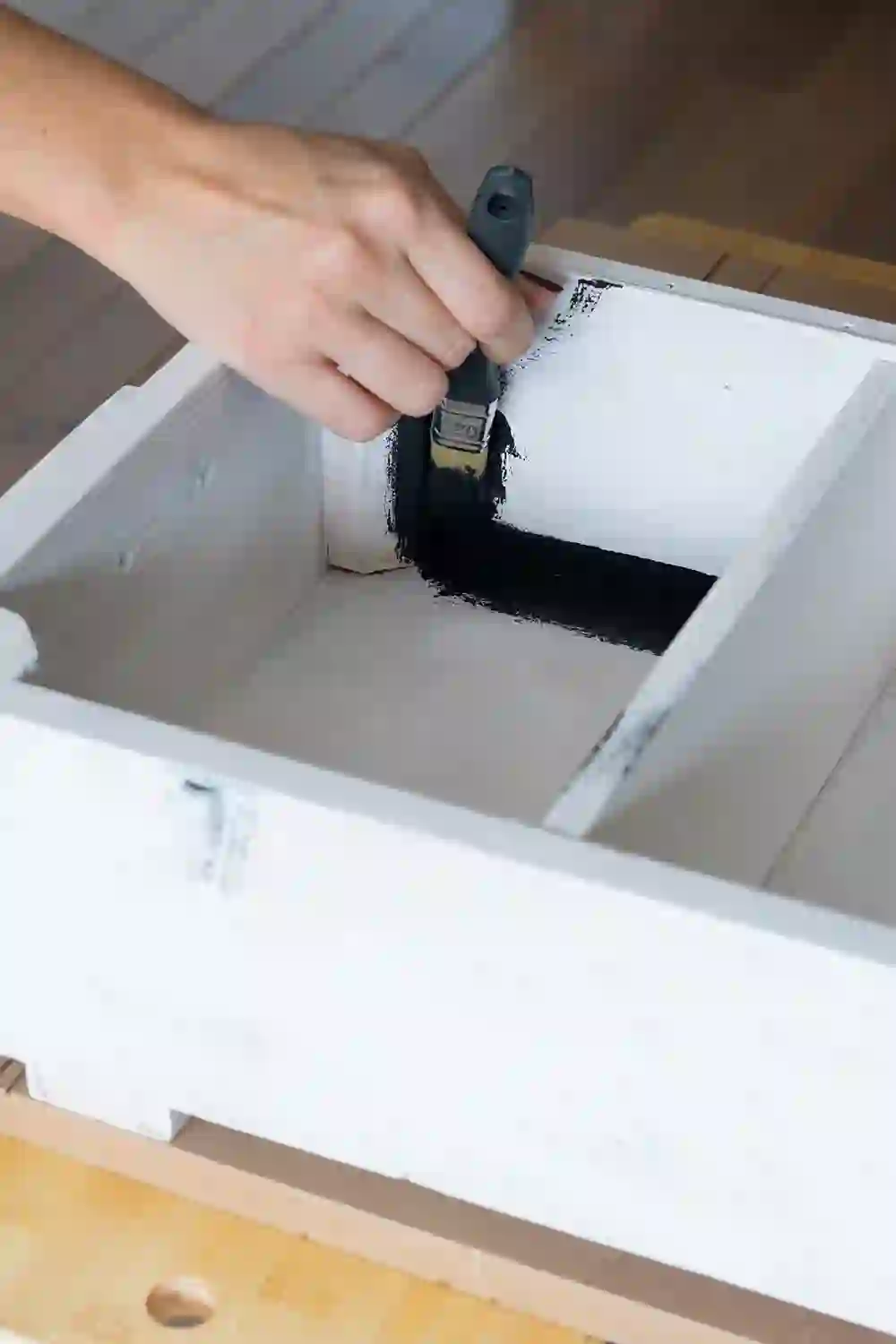 Nadat ik het plankje had toegevoegd, wilde ik het kastje een andere kleur geven. Eerst maakte ik het kastje goed schoon en zette het daarna in de grondverf. Nadat de grondverf goed was gedroogd, kreeg het kastje twee laklagen in de kleur Geldersblauw van Flexa. Een mooie diepe kleur die het kastje een rijke uitstraling geeft. Dwars op de achterkant van het kistje zaten twee kleine balkjes die erg goed van pas kwamen bij het ophangen van het kastje. Ik schroefde hier twee schroefhaken in en draaide twee schroeven in de muur waar ik de schroefhaken weer aan kon hangen. Wanneer het kastje eenmaal hangt, zie je hier dus ook niets meer van.