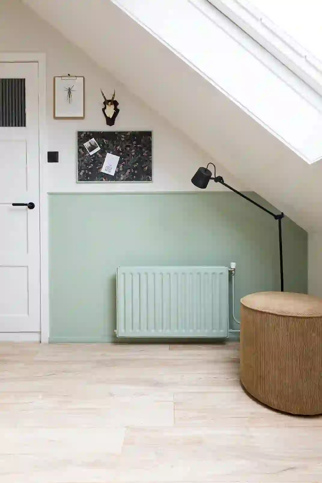 Het gaat hier om een oude radiator in een saai hoekje. Hoe maken we hier een mooi geheel van? We beginnen met het plaatsen van een sierlijst. Vervolgens verven we de muur boven de lijst mat wit, en maken we de sierlijst, wand, radiator en plinten opvallend groen (Histor Opvallend S 3010-G30Y). Zo creëren we een rustige, groene lambrisering en wordt alles één geheel.