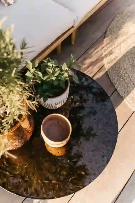 Dat de aankleding van de tuin steeds populairder wordt, is wel te zien aan de diversiteit van het tuinassortiment. Voor de accessoires koos ik ook items in dezelfde warme tinten, maar wel met verschillende patronen en structuren. Op deze manier creëer je een speels geheel. Bijvoorbeeld een rotan dienblad, een vaas met strepen of een asymmetrische vorm, gecombineerd met het hout van de salontafel.