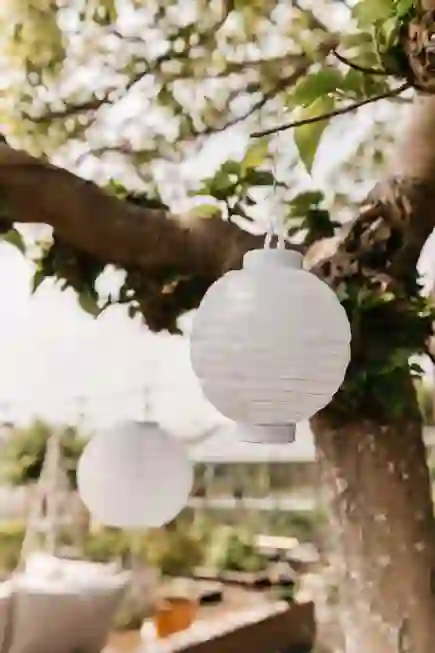 Om de omgeving bij de styling te betrekken heb ik sfeervolle lampionnen in de boom en een lichtsnoer die dwars door de tuin loopt opgehangen. Naast dat dit heel gezellig staat geven ze de tuin ook direct een mooi verlicht sfeertje zodra de zon ondergaat. Het lichtsnoer heb ik bevestigd aan kastanjepalen die ik op verschillende plekken in de grond heb gezet. Kastanjepalen zijn niet alleen functioneel, maar ook erg decoratief! Wij hebben ze op verschillende plekken in de tuin gebruikt. De parasol koos ik in een neutrale zandkleurige tint, maar door de mooie belijning echt een eyecatcher!