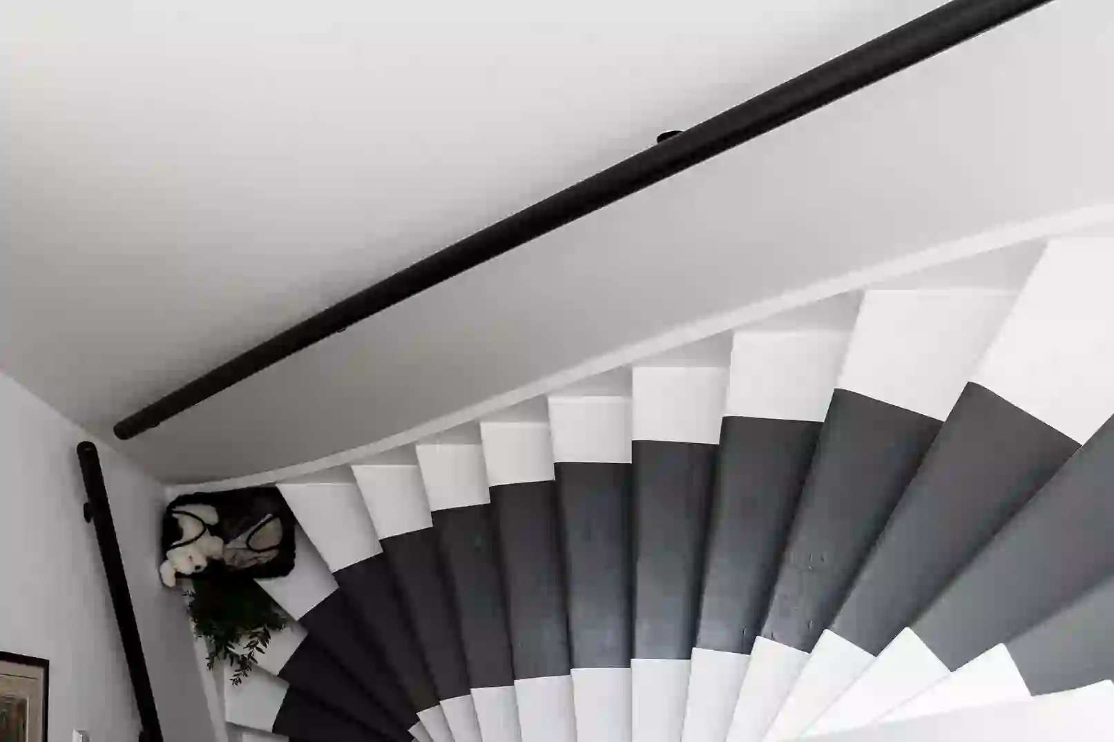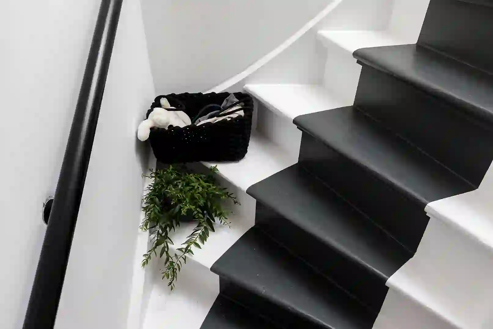 De basis van de trap maken we weer fris wit. Om de trap in balans te houden, geven we de trapleuning een zwarte kleur.