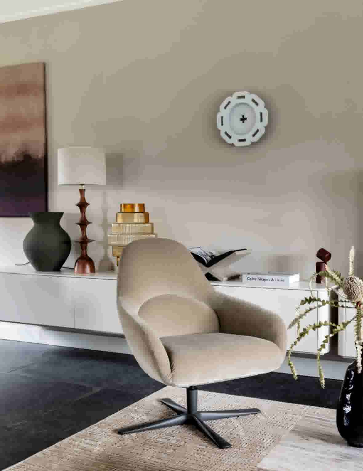 Bij een retro chic-interieur zorgen warme lichte muren juist voor balans. Ze vormen een rustige achtergrond voor grafische vormen, diepe kleuren en glanzende materialen.